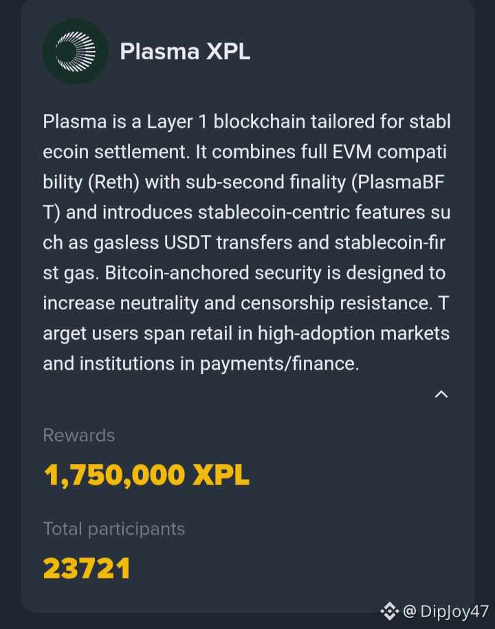 Plasma is a Layer 1 blockchain tailored for stablecoin settlement. It combines full EVM compatibility (Reth) with sub-second finality (PlasmaBFT) and introduces stablecoin-centric features such as gasless USDT transfers and stablecoin-first gas. Bitcoin-anchored security is designed to increase neutrality and censorship resistance. Target users span retail in high-adoption markets and institutions in payments/finance.