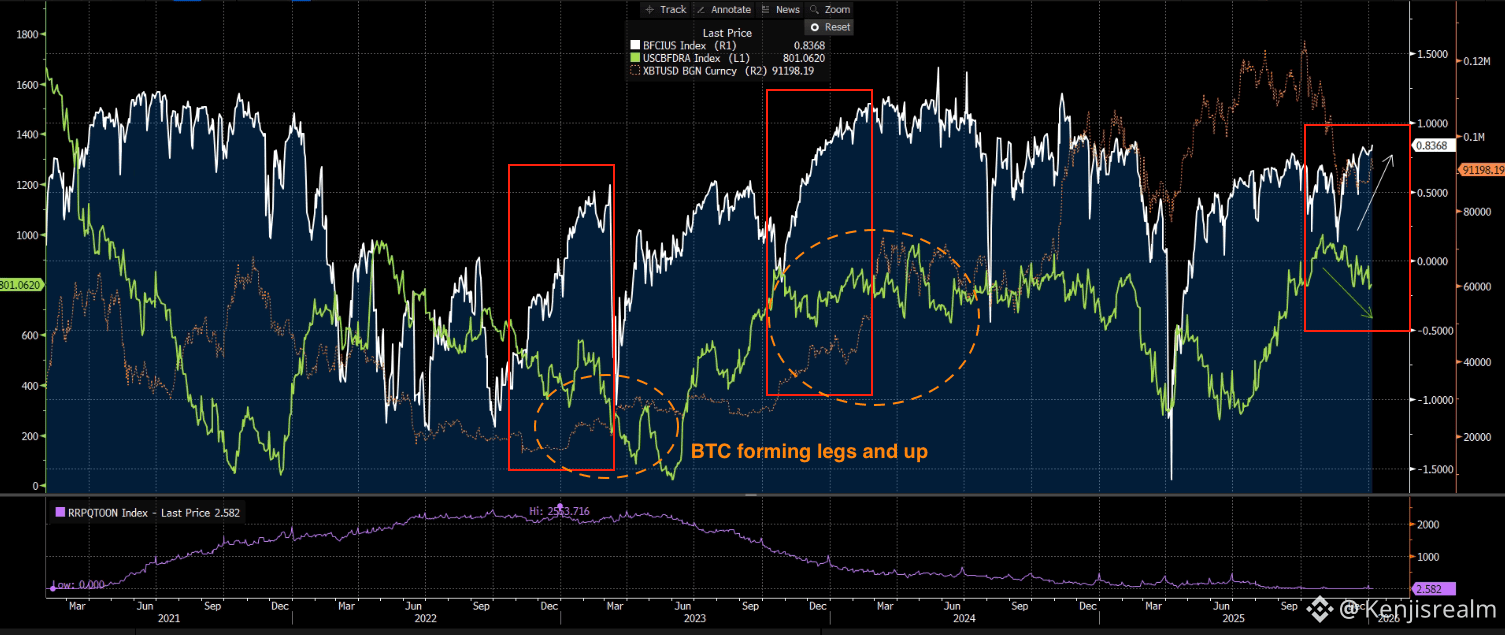 美國逆回購市場接近歸零、美國國庫資金正在流出,美國的金融環境指數持續向上並突破 2025 高點,這在過去對 BTC 是個積極信號,由圖七可見,紅框處是金融環境指數向上飆升的時期,搭配財政部持續支出,BTC 整體出現向上趨勢(橘圈處 BTC 經歷調整後繼續向上),再疊加法案上路與機構採用,BTC 要走進熊市真的有難度,短期的拉回都是很好的上車機會。