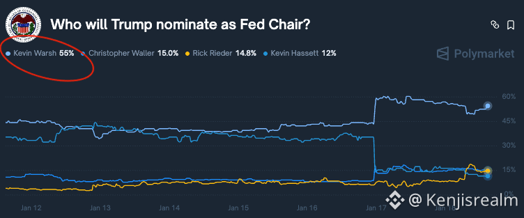 最近貴金屬交易正熱,但本週已經開始見到貴金屬市場的動能正在減弱,未來出現幾週盤整或修正並不會太意外。尤其本週美聯儲的新聞開始浮上檯面,美國財長 Besset 預告下週會公布新美聯儲主席的人選,川普本週公開提到希望 Hasset 留在原有的崗位,這讓預測市場 Polymarket 對 Warsh 當選新任主席的預期快速飆升到 55%(如圖一),是目前最有”機會“但又令人”疑惑“的人選...畢竟如之前所說 Warsh 是個長期鷹派主義者,這與川普希望的低利率環境明顯衝突,市場普遍只能認為可能雙方已經私下達成協議配合降息?!💆🏻‍♂️但這真的是個不確定性因素啊…