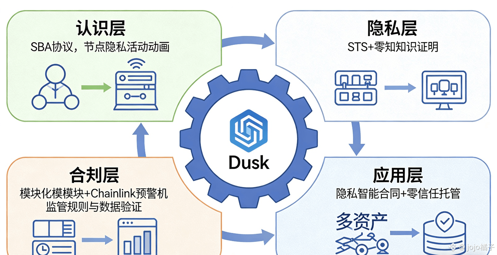 Dusk之所以能够打破“不可能三角”,核心在于其独创的“模块化架构”——将网络功能拆分为共识层、隐私层、合规层、应用层四个独立模块,每个模块专注解决一个核心问题,同时通过跨模块协同实现效率、隐私、合规的三重平衡。
