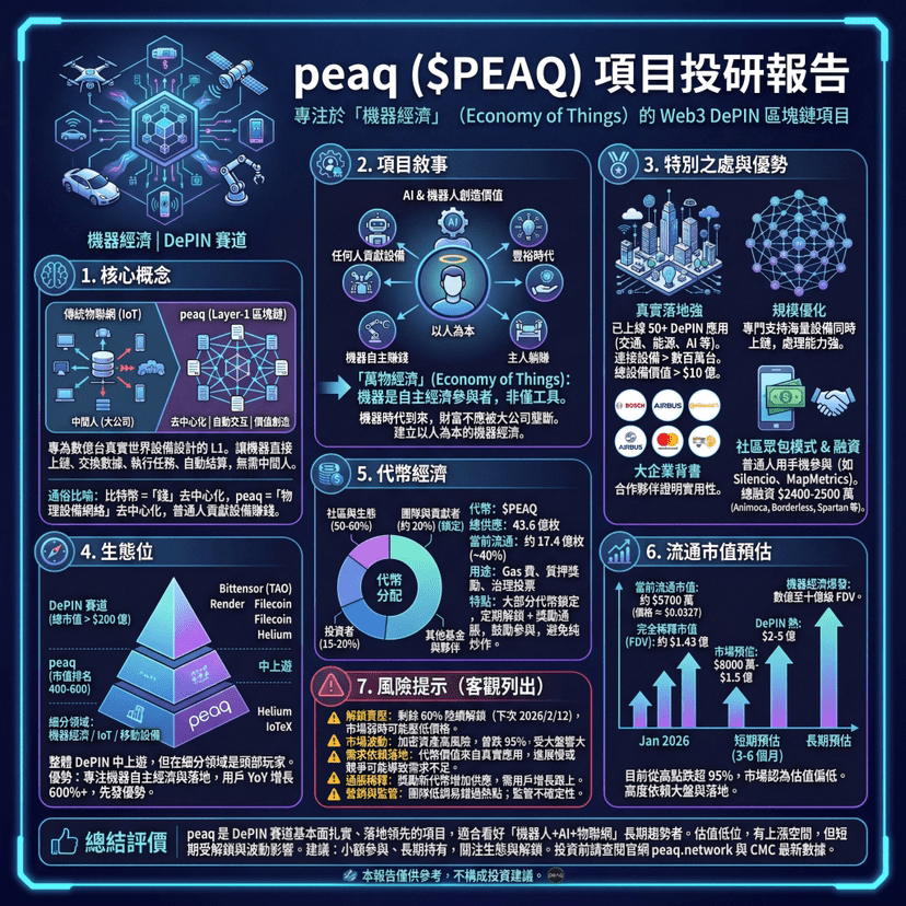 peaq è un progetto con fondamentali solidi e una realizzazione avanzata nel campo DePIN, particolarmente adatto agli investitori ottimisti sul lungo termine delle tendenze «robot + AI + Internet of Things». Attualmente, la valutazione è relativamente bassa, con spazio per crescere, ma a breve termine è molto influenzata dai sblocchi e dalla volatilità del mercato.