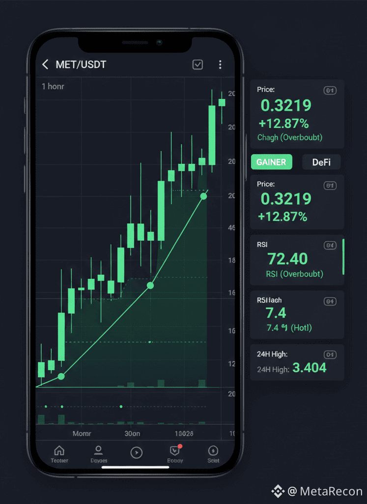 The MET/USDT pair is demonstrating a powerful bullish surge in the DeFi sector, currently trading at $0.3219—an impressive +12.87% surge over the past 24 hours. This places it firmly in #Gainer territory, backed by strong trading volume exceeding $15 million USDT. Technically, the price is trading well above the Parabolic SAR level of $0.2936, confirming a robust upward trend structure. However, the RSI(6) reading of 72.40 indicates overbought conditions, suggesting the need for cautious momentum watching. The MACD remains positively aligned with a bullish histogram, reinforcing near-term strength. Traders should monitor the key resistance at $0.3404 (24-hour high) for a potential breakout continuation, while $0.2936 serves as critical trend support. With MET showcasing such vigorous price action, it remains a token to watch closely in the coming sessions.