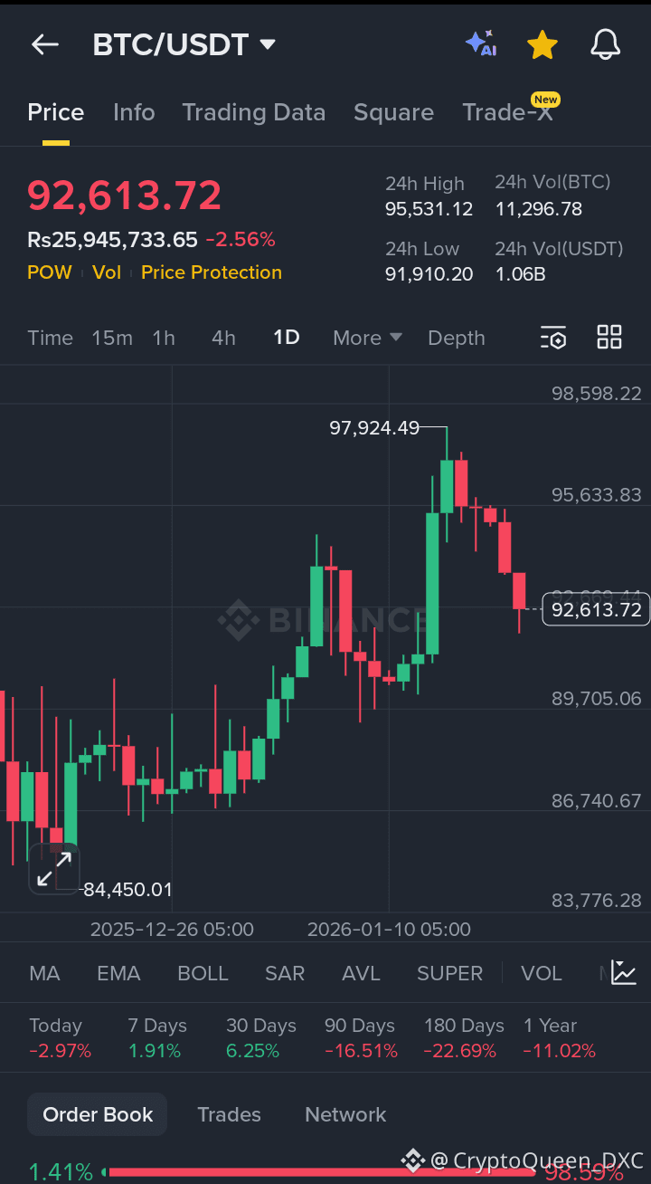 Support Zone: The price is currently testing a critical psychological level. Maintaining sentiment and price above $92,000 is considered vital for keeping the broader bullish structure intact