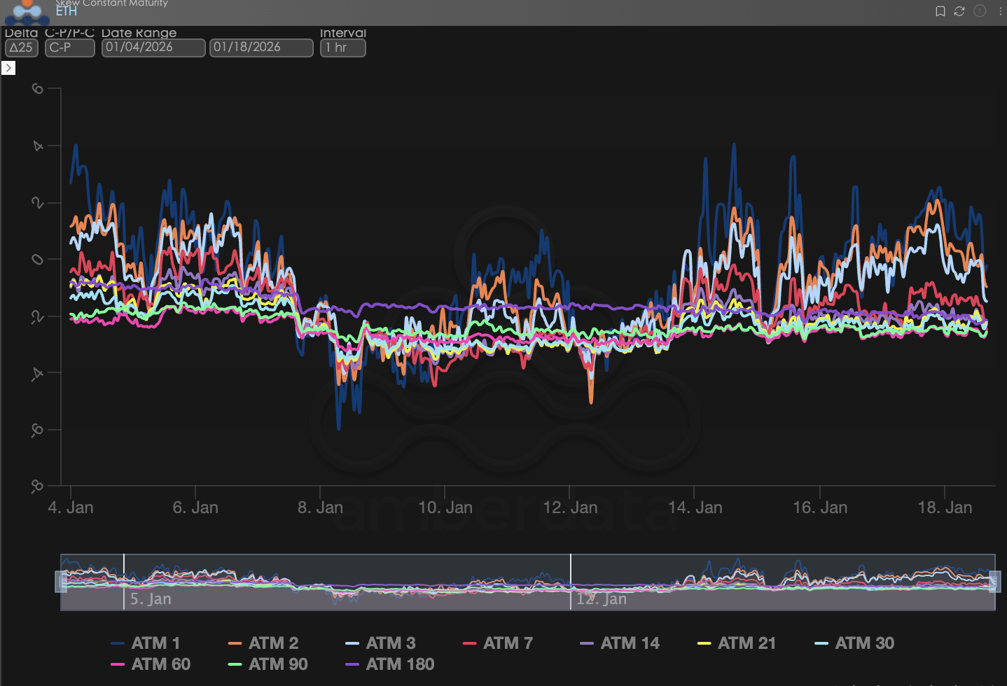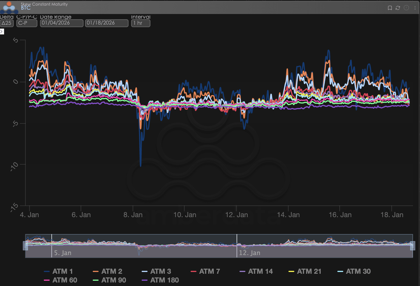 Osservando la Delta 25 Skew (volatilità implicita IV delle opzioni call - IV delle opzioni put), l'ampiezza del valore negativo riflette la domanda di copertura del mercato per il rischio di coda al ribasso.
