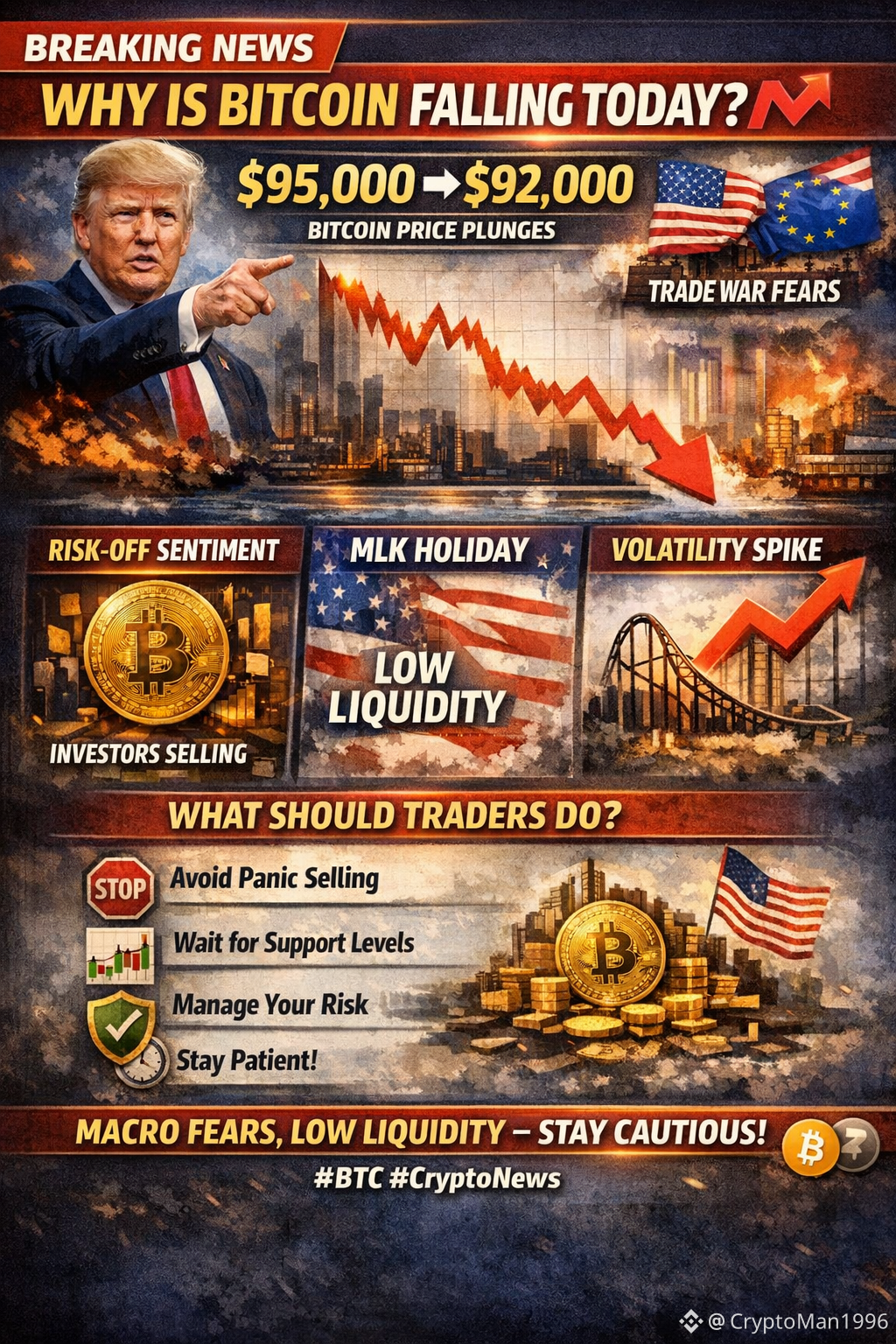 How it affects Bitcoin? When there is a fight between big countries, investors get scared. They sell risky things like Bitcoin to save their money. Also, today is a holiday in the US (MLK Day), so there is less money in the market. This makes the price fall even faster.