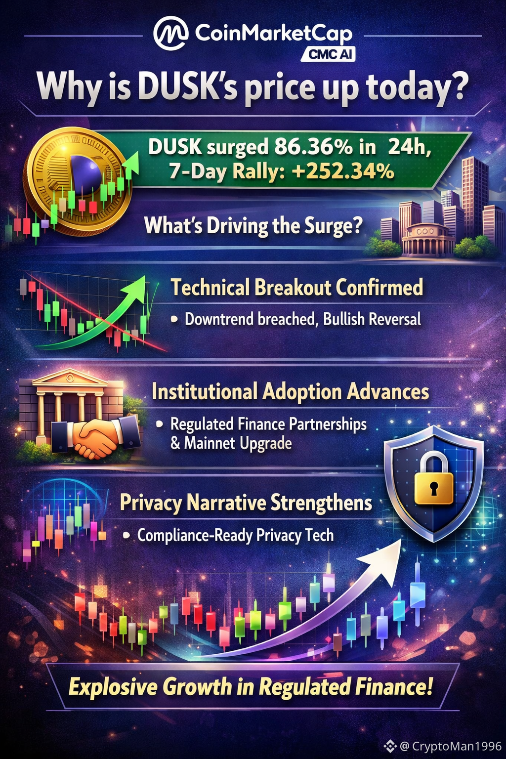 DUSK surged 86.36% in 24h, outperforming the broader crypto market (-2.79%) and extending its 7-day rally of 252.34%. This explosive growth was driven by a technical breakout, institutional adoption catalysts, and narrative momentum in regulated finance. Here are the main factors: