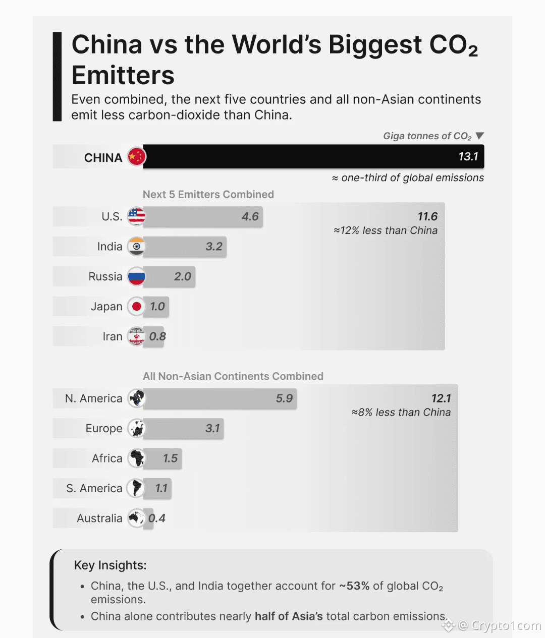 Even all non-Asian continents together emit less CO₂ than China alone. (12.1 vs 13.1 gigatonnes)