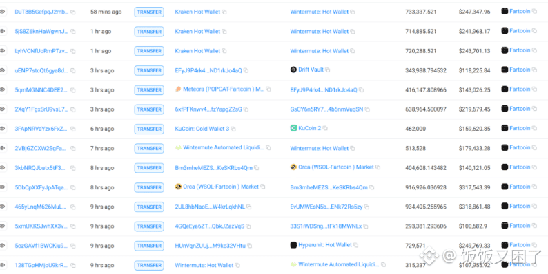 Solscan 数据显示,Kraken 和 Gate.io 将 FARTCOIN 分批次转移至 Wintermute,平均每批价值约 20 万美元。这引发了其他交易者跟随抛售,进一步加大了价格压力。虽然交易所抛售意味着短期价格走弱,但从另一个角度看,也为买家提供了入场机会,尤其是在资金回流和市场情绪改善时。