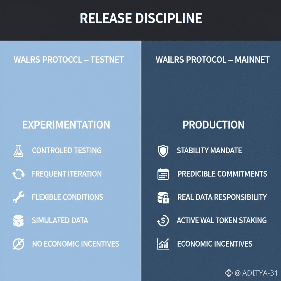 Walrus ka architecture bhi is staged thinking ko support karta hai. Data shards me distribute hota hai, epochs ke through time organize hota hai, aur commitments predictable cycles me operate karte hain. Short test cycles Testnet ko fast iteration ke liye allow karte hain, jabki longer Mainnet epochs stability aur planning space dete hain. Storage ke context me yeh balance critical hota hai.