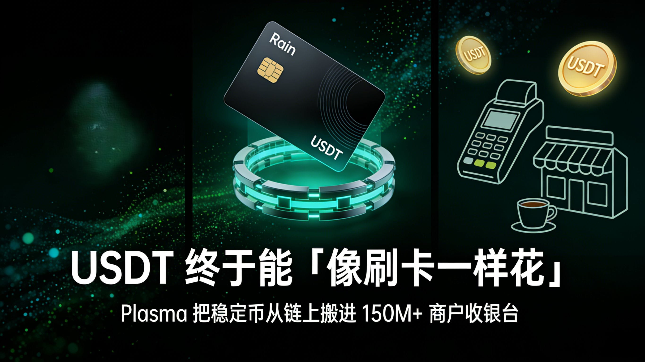 兄弟们,晚上好。阿祖来啦!过去两年我写稳定币写到快麻木:链上转账再便宜、结算再快,最后都卡在同一个问题——你把钱变成了 USDT,然后呢?大多数链的答案仍然是“再换回法币”或者“找个支付中间商”,这就像把高速公路修到城门口,最后一公里还得走土路。Plasma 最近一个动作让我觉得它终于在补这段“最后一公里”:他们宣布 Rain 已经接入 Plasma,Raincards 让个人和商家可以把 Plasma 上的 USD₮ 直接带到覆盖 150M+ 商户的消费网络里。你可以把它理解成一句更直白的话:稳定币不再只是“能转”,开始变成“能花”。