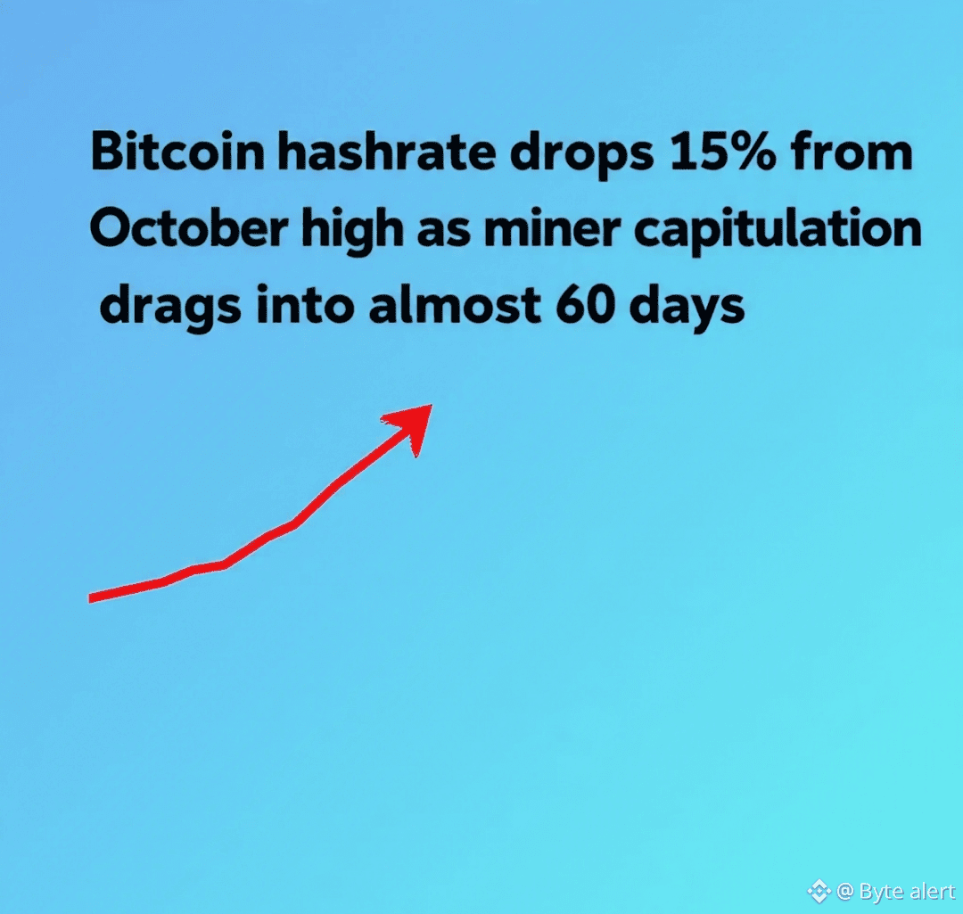 Bitcoin’s network hashrate has fallen nearly 15% from its October peak, signaling ongoing pressure across the mining sector. The decline suggests that miner capitulation has now stretched close to 60 days, as rising operational costs and reduced profitability force less-efficient miners to shut down or exit the market.