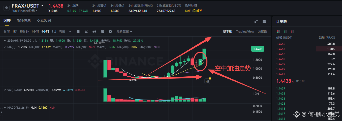 此前FRAX长期在0.64-0.71美元区间震荡,12月24日技术分析显示其强阻力位在1.03美元。1月15日交易所利好落地后,FRAX快速突破1.03美元阻力位,19日盘中触及1.49美元,形成“突破-回踩-再上涨”的空中加油健康走势,阻力位转化为支撑位,短期上行空间被打开。