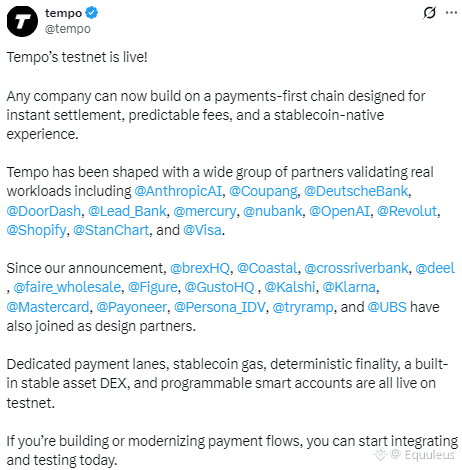 Tempo — EVM-сумісний блокчейн рівня Layer 1, орієнтований на платіжні операції та роботу зі стейблкоїнами. Проєкт залучив близько $500 млн інвестицій від Stripe та Paradigm. У грудні 2025 року було запущено публічний testnet для тестування платіжної інфраструктури та stablecoin-рішень.