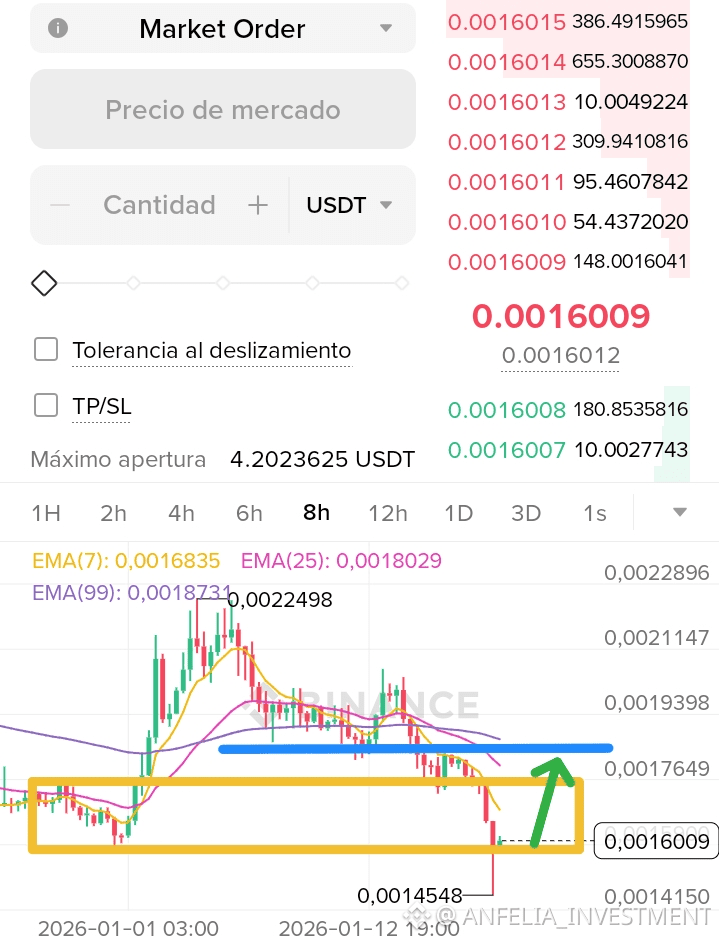 * Confirmación: Sería ideal esperar a que una vela de 4h o 8h cierre por encima de 0.00165 para confirmar que el soporte naranja está aguantando la presión de venta de las noticias de Binance.
