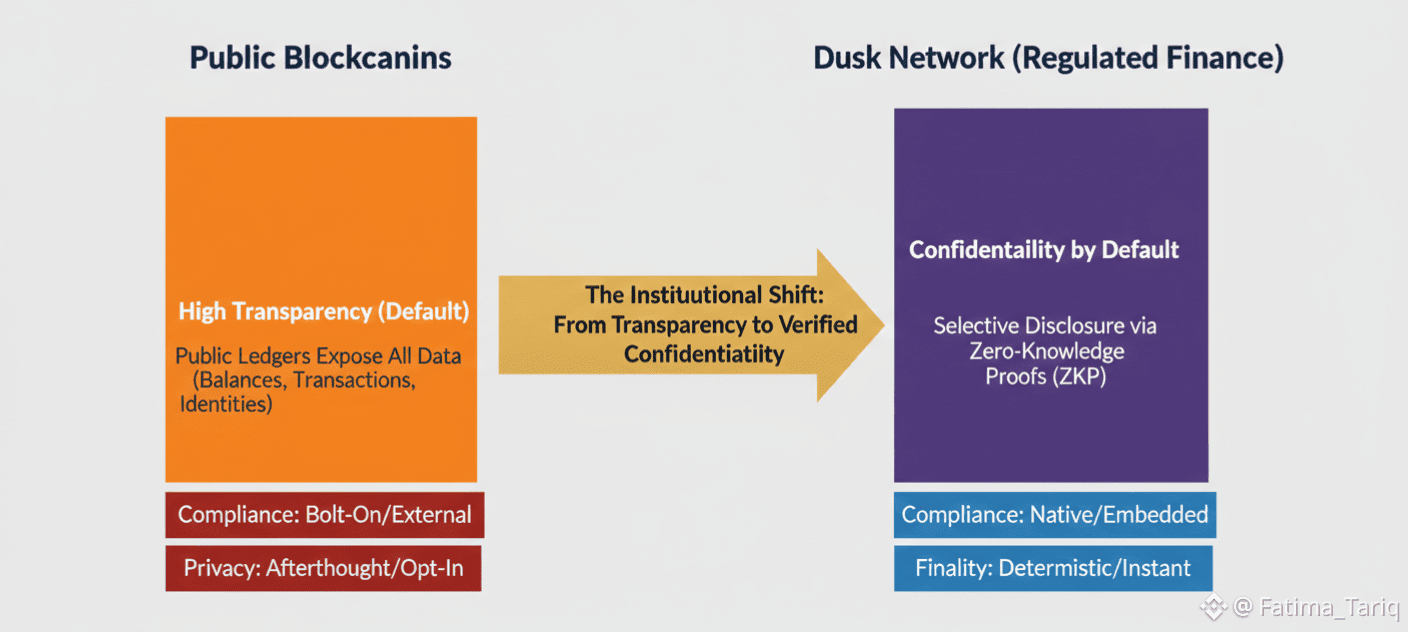 The moment I realized that “regulated DeFi” isn’t just a buzzword didn’t come from a whitepaper. It came from watching how quickly things fall apart when real money crosses borders. A trader friend once tried to settle a straightforward private deal using a stablecoin. The logic was simple: instant transfer, no banks, no friction. In practice, it stalled immediately. The recipient couldn’t accept the funds without answering uncomfortable questions—where did the money come from, was it compliant, and how would they later justify it to a bank? In the end, they routed everything through traditional rails anyway.That’s the reality most crypto narratives gloss over. Speed alone isn’t enough. Regulated finance needs privacy, rules, proofs, and accountability—simultaneously. That tension is exactly where Dusk Network positions itself, and it’s why the project attracts a different kind of attention from traders and long-term investors.Dusk isn’t trying to be a generic Layer 1. It’s positioning itself as infrastructure for regulated financial markets, where privacy isn’t about evading oversight but about protecting sensitive financial activity while still meeting compliance requirements. That distinction matters. Most people hear “privacy” and think of anonymity. Dusk’s version of privacy is closer to how traditional finance actually works: disclosure on a need-to-know basis.At the heart of the problem is a contradiction baked into public blockchains. Transparency is a feature—but financial markets aren’t built on radical transparency. Your bank balance isn’t public. Your portfolio isn’t public. Your trade sizes aren’t public. Even in heavily regulated systems, information is compartmentalized. Auditors, regulators, counterparties, and institutions see what they’re entitled to see—no more, no less. Public blockchains flipped that model by exposing everything to everyone. That worked for early crypto culture, but it breaks down the moment you talk about tokenized securities, bonds, or institution-grade settlement.Dusk’s core bet is that the next phase of on-chain finance won’t be fully public DeFi—it will be regulated markets moving on-chain with privacy embedded at the protocol level.