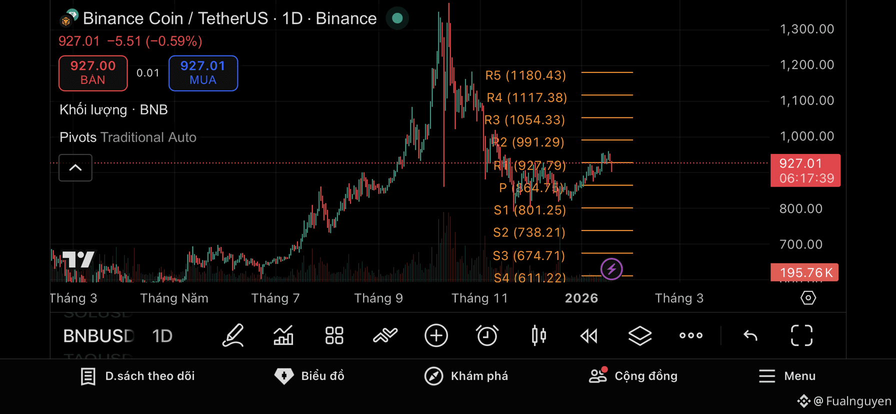 The equilibrium level sits at $864—a price zone BNB has repeatedly broken above and retested, proving its strength—while coming close to R2 at $991. This means BNB has already run two legs for every one leg that other altcoins managed during their sprint phases. Over the past four months, price has only dipped slightly below the pivot (P) before rotating back up to test it again, oscillating around this area. This confirms the absence of meaningful selling pressure. BNB holders tend to have strong hands and control a significant volume.