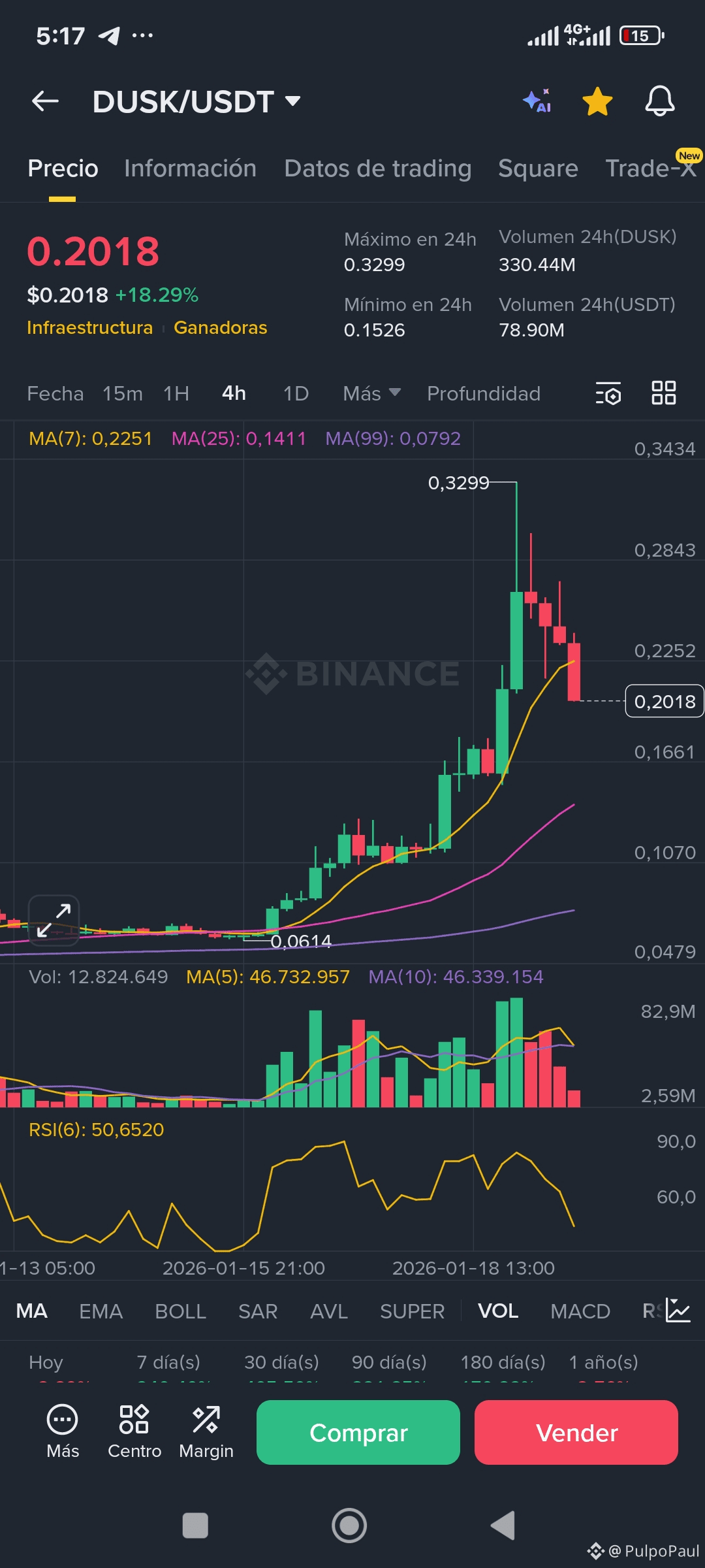 DUSK ha tenido un rally impresionante. Entrar ahora es arriesgado debido a la volatilidad, pero vigilar el soporte de los $0.15 - $0.16 podría ofrecer una oportunidad de entrada más segura para quienes buscan el rebote. ¡Siempre con Stop Loss! 🛡️