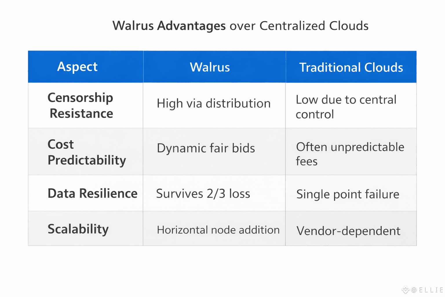 Walrus isn’t just another cloud alternative—it’s a full-on challenge to the centralized giants that have dominated storage for years. Those big-name clouds? They’re convenient, sure, but you’re stuck with single points of failure, random outages, censorship risks, and bills that just keep climbing. Walrus flips that whole model. Built on Sui, it’s decentralized by design, so you get stronger reliability, lower costs, and a system that’s actually built for things like AI, DeFi, and everything Web3. This isn’t about catching up to AWS or Google Cloud. Walrus is already beating them where it really counts: rock-solid uptime, transparent fees, and true freedom from censorship. Sick of getting boxed in by your cloud provider? Walrus gives you an actual way out.