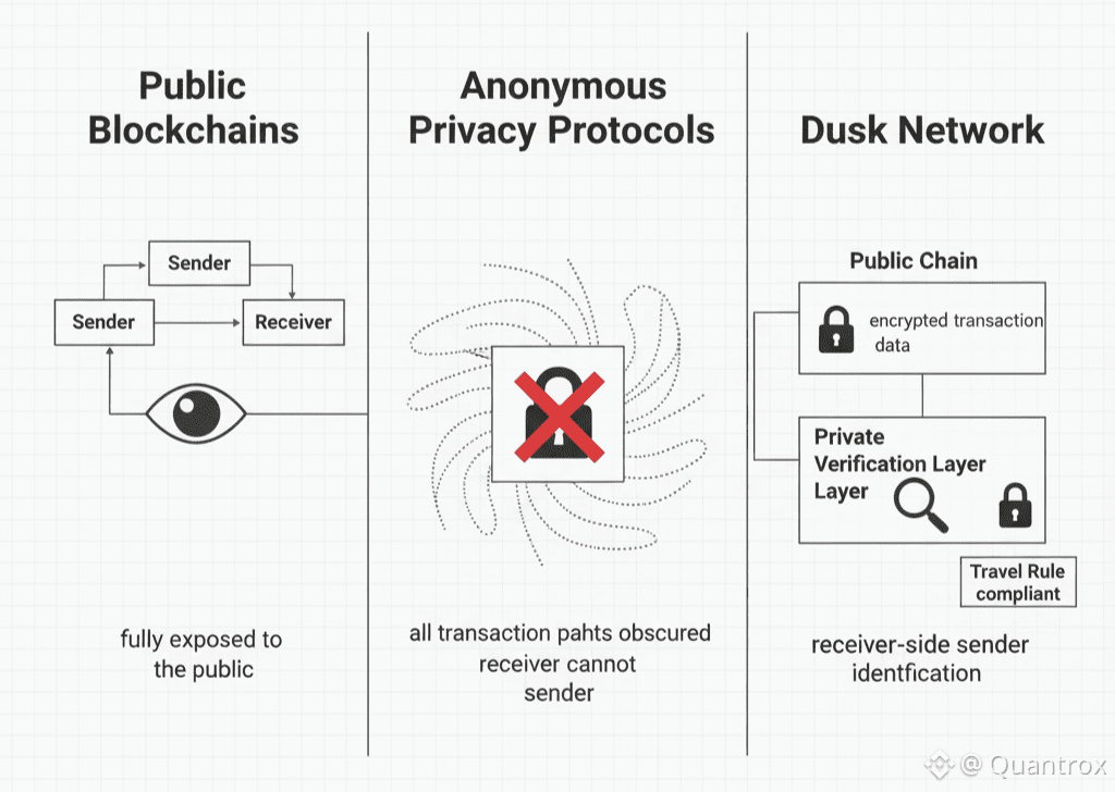 Instead of choosing anonymity, Dusk built privacy that works within regulatory frameworks. Dusk shielded transfers encrypt transaction details on-chain, keeping them invisible to the public and to competitors. At the same time, Dusk allows the receiver to identify the sender and generate cryptographic proof of that identification when required. Privacy for the public, accountability for authorized parties.