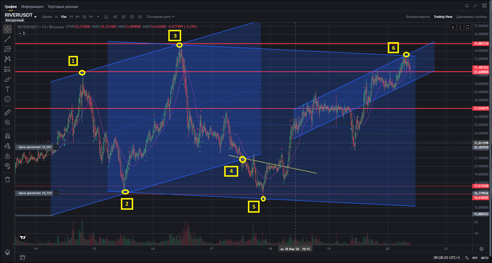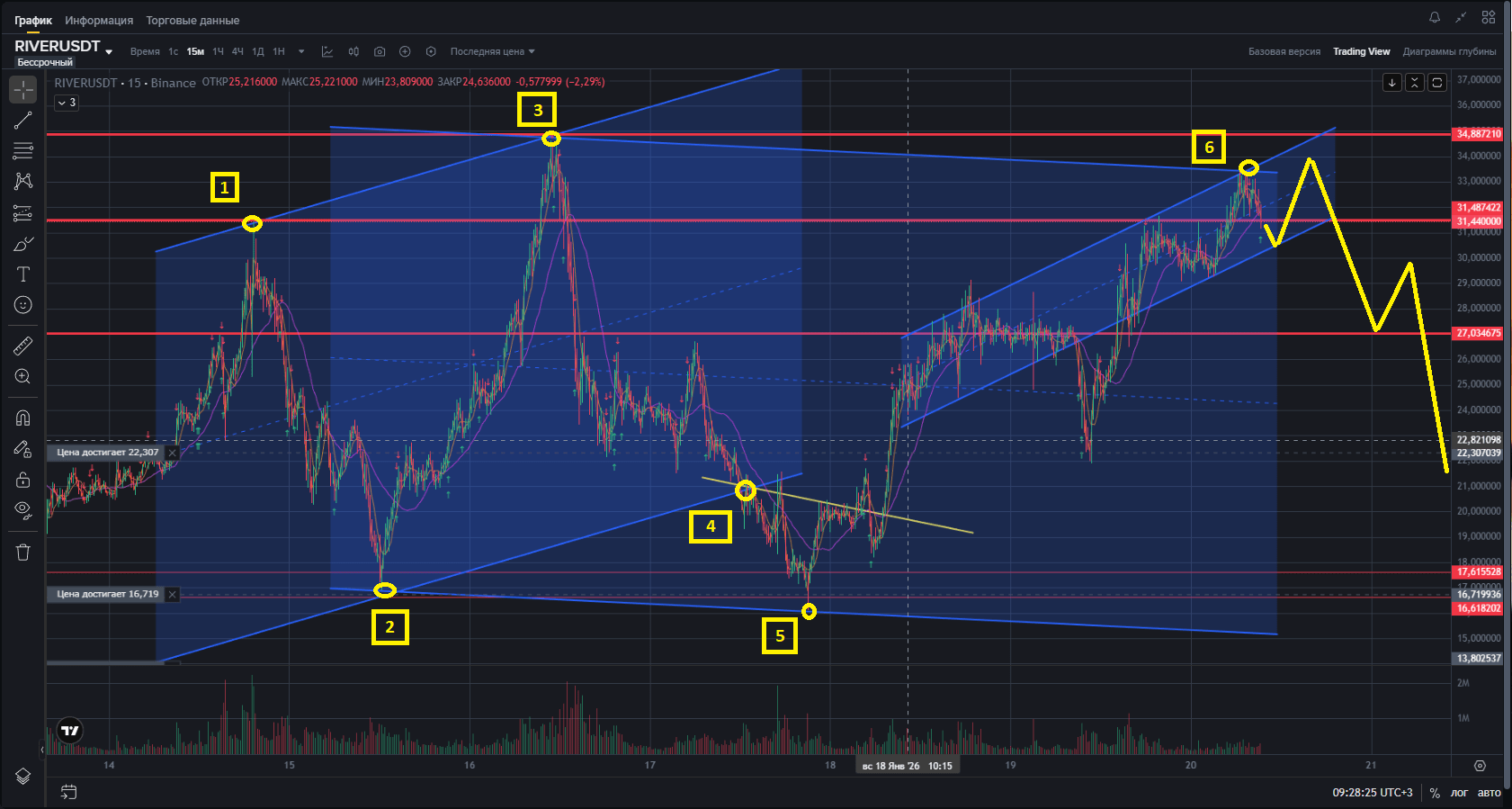 Il prezzo non romperà il massimo 34,88 e sarà in laterale per spremere gli shortisti ancora per un po', fino a quando non crollerà verso il confine inferiore del canale, circa a 15