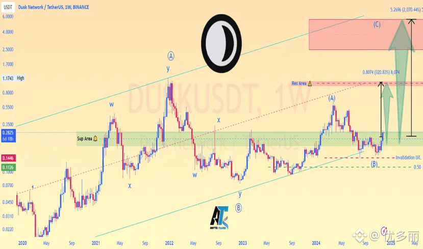 从技术面看,DUSK去年 0.03 美元附近已经筑底完成,最近放量突破长期压制位,0.21 美元的震荡属于健康回踩。只要守住 0.15-0.18 支撑,下一轮启动会更有力度。代币经济简单粗暴:Gas、Staking、治理三位一体,外加通缩烧毁,流通量 5 亿左右,市值才 1 亿多美金。在 RWA 这个万亿级叙事里,DUSK 的卡位还没被价格充分反映。