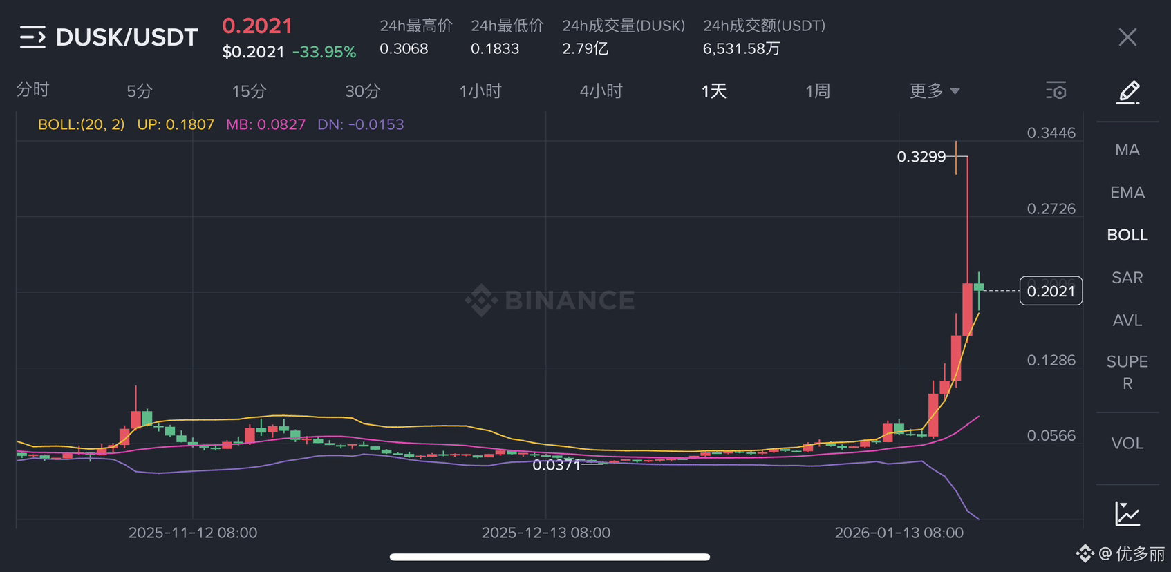 加密市场从来不缺戏剧性,就在 1 月 19 日,DUSK 像坐了火箭,从 0.15 美元附近直冲 0.32 美元高点,短短一天涨幅超过 100%,隐私币板块整体被点燃,交易量瞬间冲到几十亿美金级别。结果隔天一开盘,价格直接大幅回落,从最高点算起回撤接近 40%,现在徘徊在 0.2 美元上下。币安 K线图上那根刺眼的长上影线,活脱脱是高位情绪过热的信号啊。