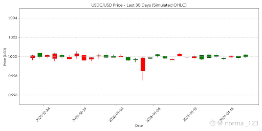 The following chart illustrates the price stability of USDC over the last 30 days. Note that while it is pegged to $1.00, minor fluctuations (wicks) are common due to exchange liquidity and high-volume trades.