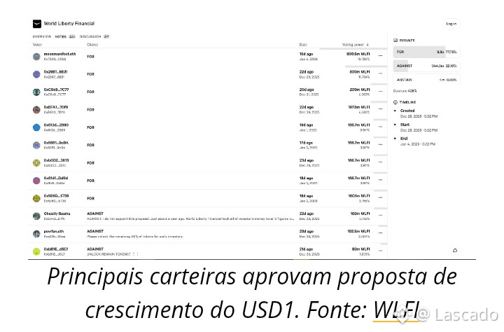 Pra você ter ideia, só as nove maiores carteiras já deram conta de quase 59% do poder de voto, ou seja, um grupinho pequeno de gente grande acabou decidindo o rumo da proposta. A maior carteira sozinha botou 18,786% do poder de voto, tudo registrado no snapshot da governança da WLFI.