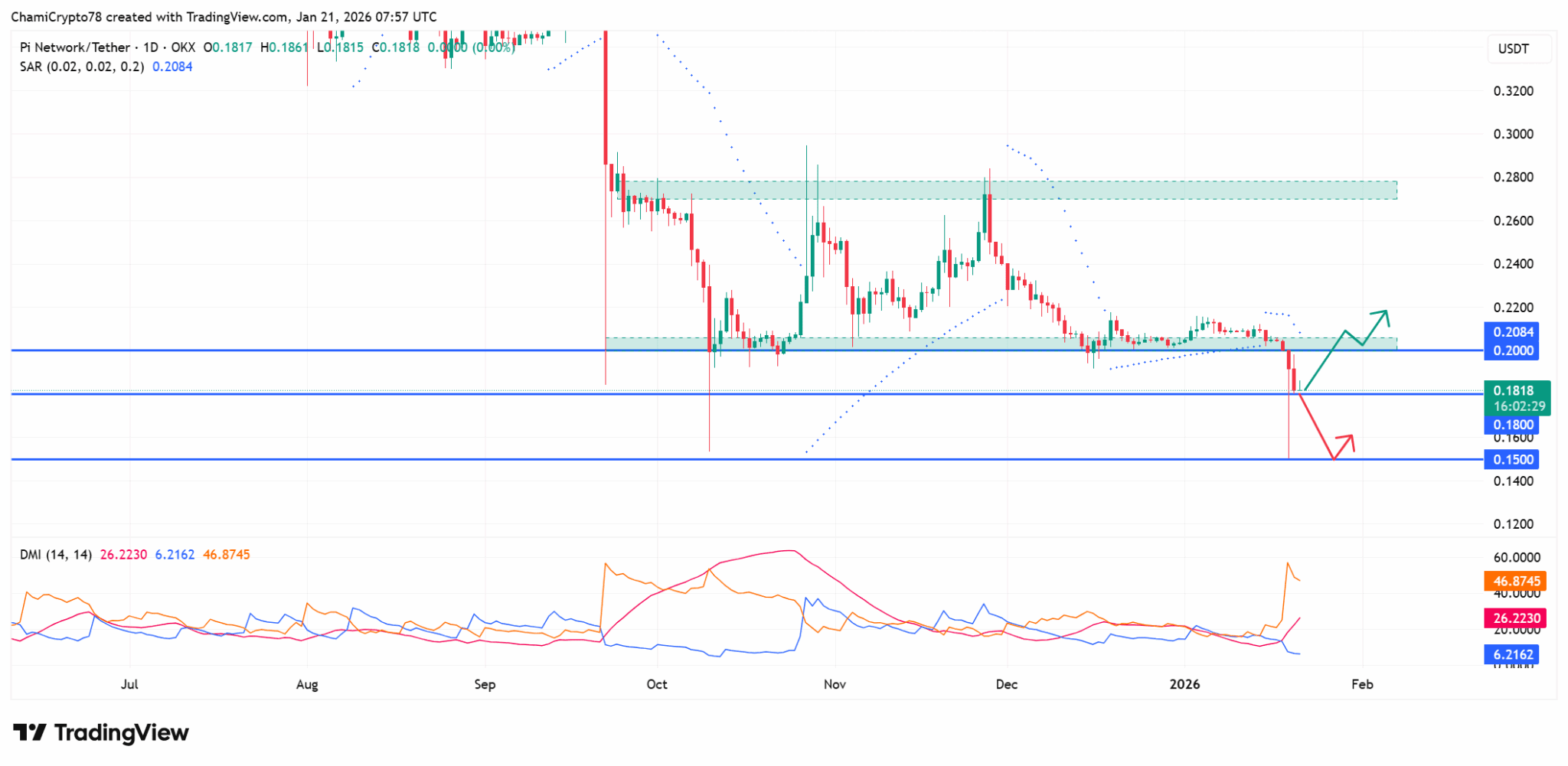 Dal punto di vista tecnico, le condizioni sono ulteriormente deteriorate dopo che Pi Coin è sceso al di sotto del livello chiave di $0,20, che è passato da supporto a resistenza. Questa rottura ha posto fine alla fase di consolidamento precedente e ha spostato il mercato in una continuazione del trend ribassista.