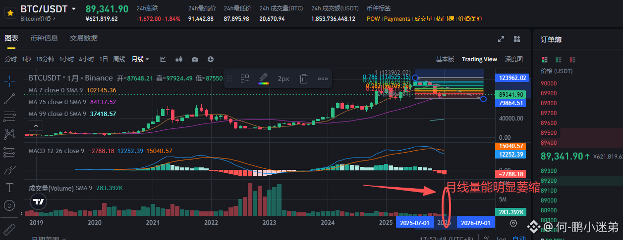 大家好,我是常年泡在币安盯盘的老交易者,1月19日$BTC 冲至98k高位又砸回92k,8亿多头清算想必不少朋友都亲历了过山车行情。今天从月、周、日、4小时、四个周期全图透视走势,结合最新消息面给实盘建议,每个小周期都标注了插图要点,方便大家对照画图,咱们不玩虚的,只讲能落地的判断。