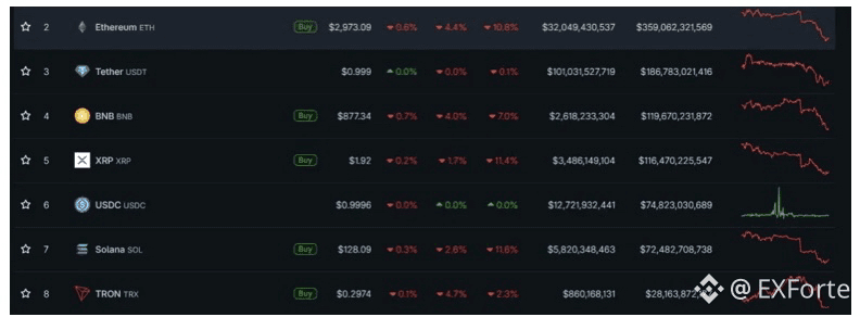 $ETH потерял 4,4% от рыночной стоимости, снизившись до $2973, $BNB — 4% ($877), XRP — 1,7% ($1,92), Solana — 2,6% ($128).
