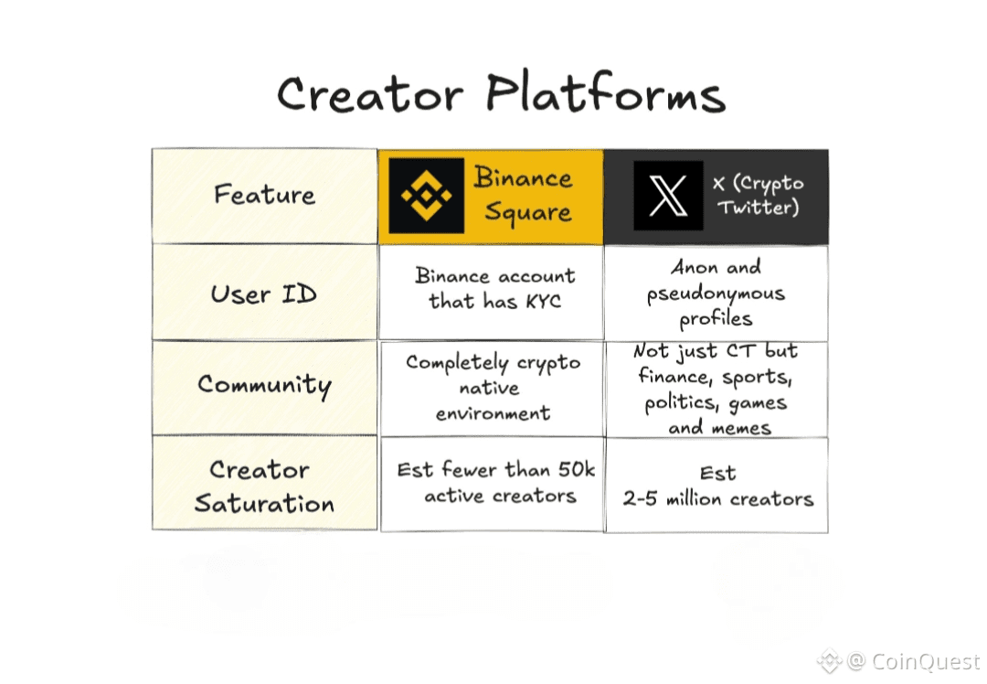 We can see a red ocean vs a blue ocean scenario here - CT represents the more red ocean, where it is a saturated environment with intense competition (now with AI slop bots) among millions of creators for a limited, albeit influential, audience. In contrast, Binance Square has an estimated of fewer than 50k creators serving a massive, untapped, and highly qualified user base. In this case, new creators can establish authority and gain visibility with far less resistance.