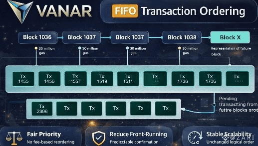 At the center of Vanar’s design is a simple idea. Transactions should be processed in the order they arrive. This model is often called First In First Out. When a user submits a transaction on Vanar, it enters the network and is placed into a shared transaction pool. The position of that transaction is determined only by time of arrival. Nothing else affects its place in the queue. When a new block is created, transactions are added one by one from the front of the queue until the block reaches its fixed gas limit. Any transaction that does not fit is not skipped or rearranged. It simply waits for the next block.