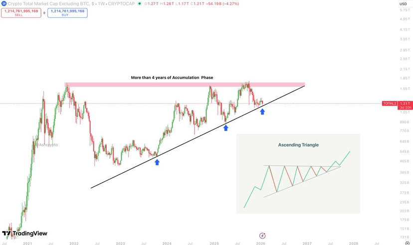 Le altcoin hanno mantenuto il loro supporto alla tendenza pluriennale, mentre il pattern triangolo ascendente rialzista settimanale rimane valido.