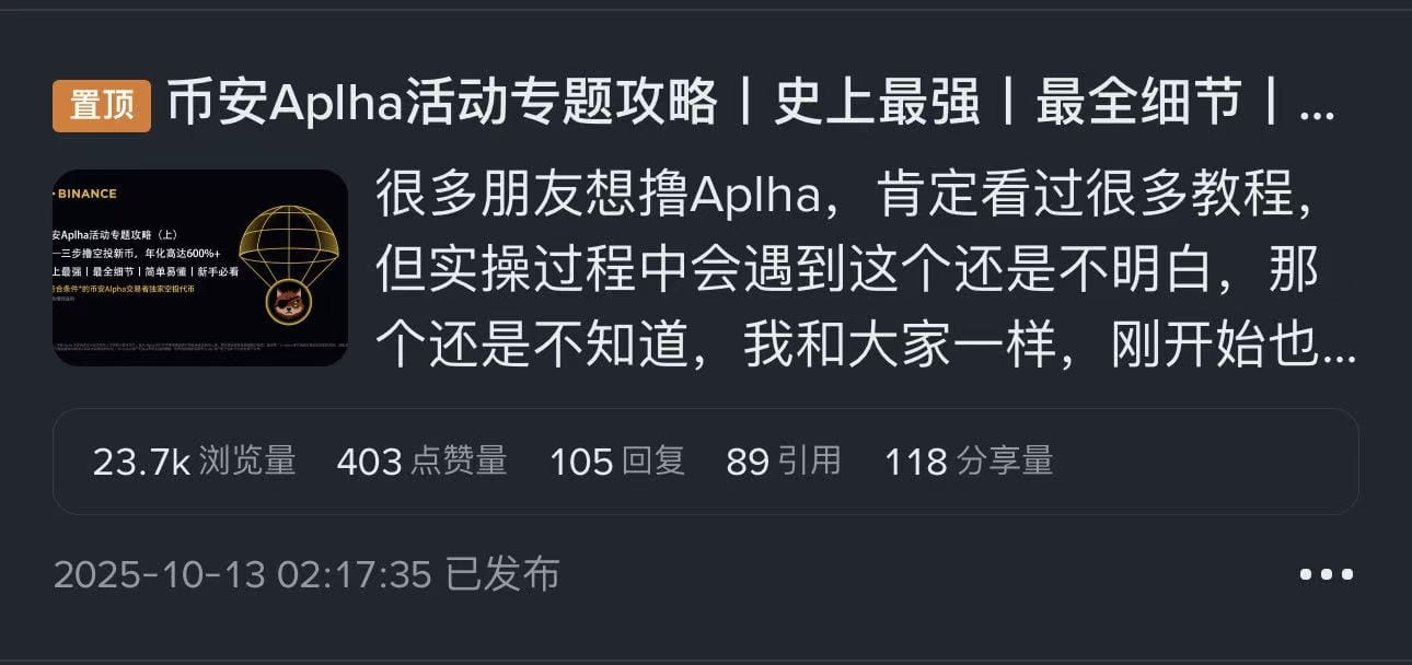 Il mio primo contenuto creativo è stato pubblicato su 🔶 Binance Square, riguardava un tutorial di base su Alpha, se sei interessato, puoi dare un'occhiata 👉 Guida all'evento Binance Alpha丨Il più forte di sempre丨Tutti i dettagli丨Facile da capire丨Must-see per principianti (parte 1) — Tre semplici passi per ottenere airdrop di nuovi token, con un ritorno annuale fino al 600%+, questo articolo ha avuto decine di migliaia di visualizzazioni, portando a un aumento di oltre 300 follower🙂