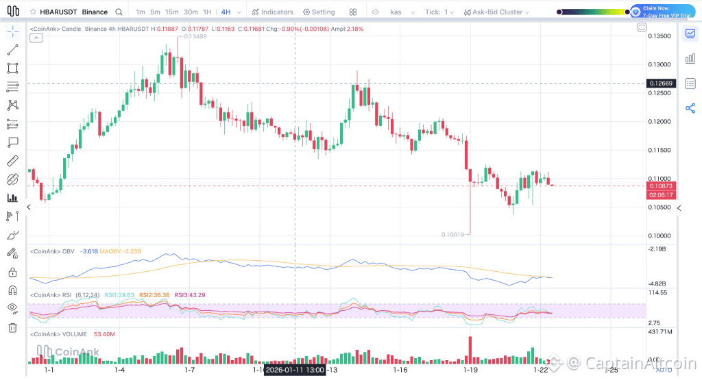 Da qui, la prima area che conta davvero al rialzo si trova intorno a $0.115–$0.118. Se HBAR può superare quel livello e mantenerlo, indicherebbe che la struttura a breve termine sta iniziando a cambiare, aprendo la porta verso $0.125 e possibilmente di nuovo verso la zona di $0.13.