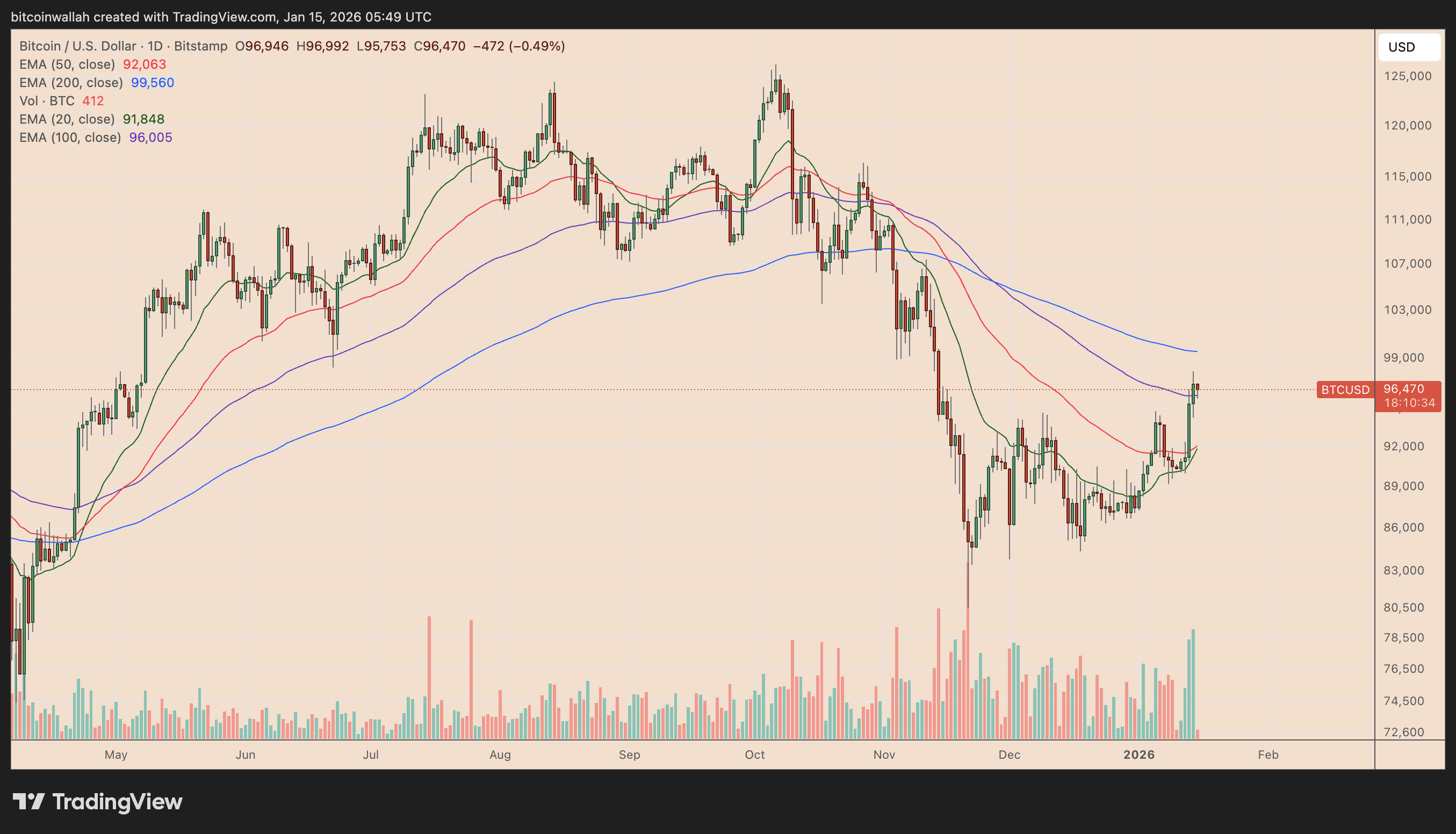 Da una prospettiva tecnica, Bitcoin sta attualmente scambiando attorno a medie mobili chiave, ampiamente utilizzate per determinare la direzione della tendenza e il momentum.