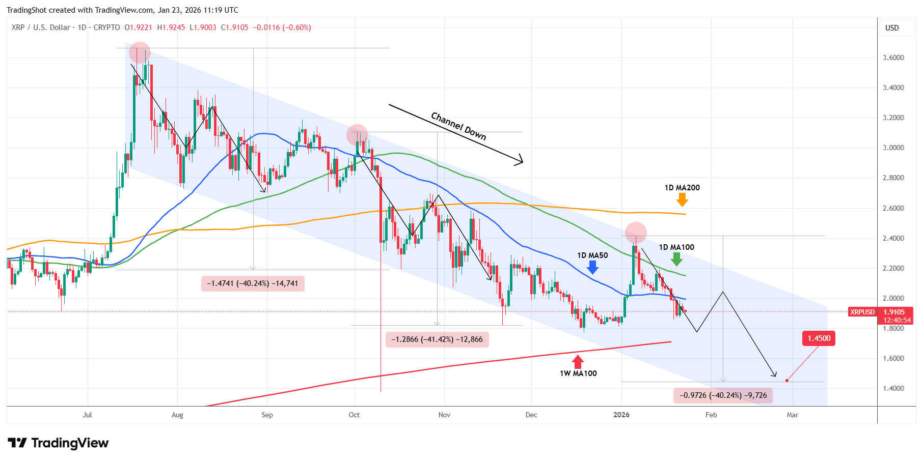Dopo aver già iniziato il suo nuovo Braccio Ribassista dopo il massimo inferiore del 06 gennaio, sembra che il prezzo non riesca nemmeno a testare la 1D MA200 (linea di tendenza arancione) per un rifiuto tecnico e la continuazione del Ciclo Ribassista. Finché non riesce a farlo, l'attuale Braccio Ribassista mira alla 1W MA100 e se viene rotto, potrebbe completare una diminuzione del -40,24% (simile a entrambi i precedenti Bracci Ribassisti) a 1.4500.