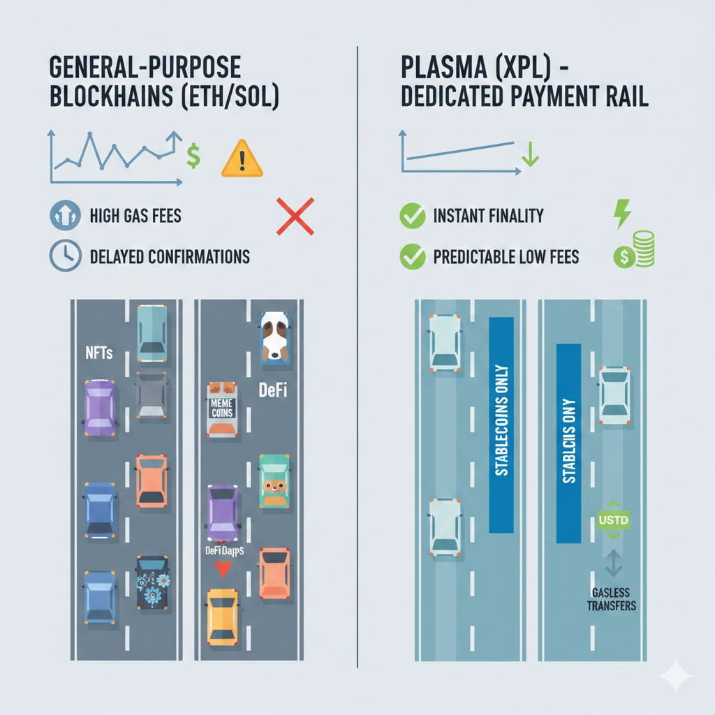 Blockchains like Ethereum and Solana are incredibly powerful, but they were designed to do everything. Payments, NFTs, DeFi, games, experiments — all of it competes for the same block space. That “one-size-fits-all” design works for innovation, but it breaks down when you try to use stablecoins for something boring but critical, like salaries, remittances, or merchant payments.