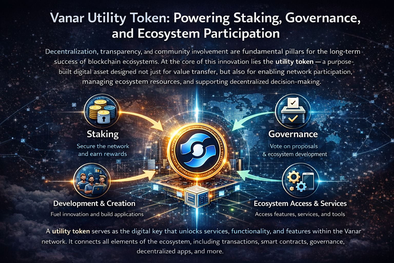 The utility token is the digital token that provides access to services, functionality, and features in a blockchain web. Unlike traditional currencies or security tokens, utility tokens prioritise usability and access over ownership rights or profit-sharing. The utility token acts as the operational backbone of the Vanar ecosystem connecting all elements of the network — including the transaction processing system, smart contracts, governance, decentralised apps, and more.
