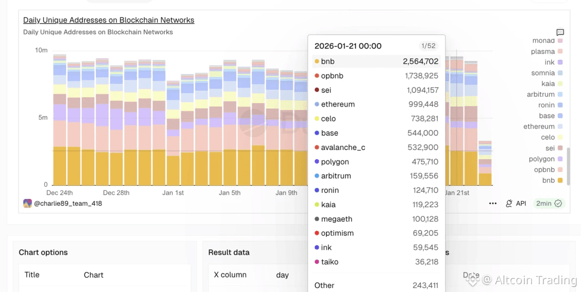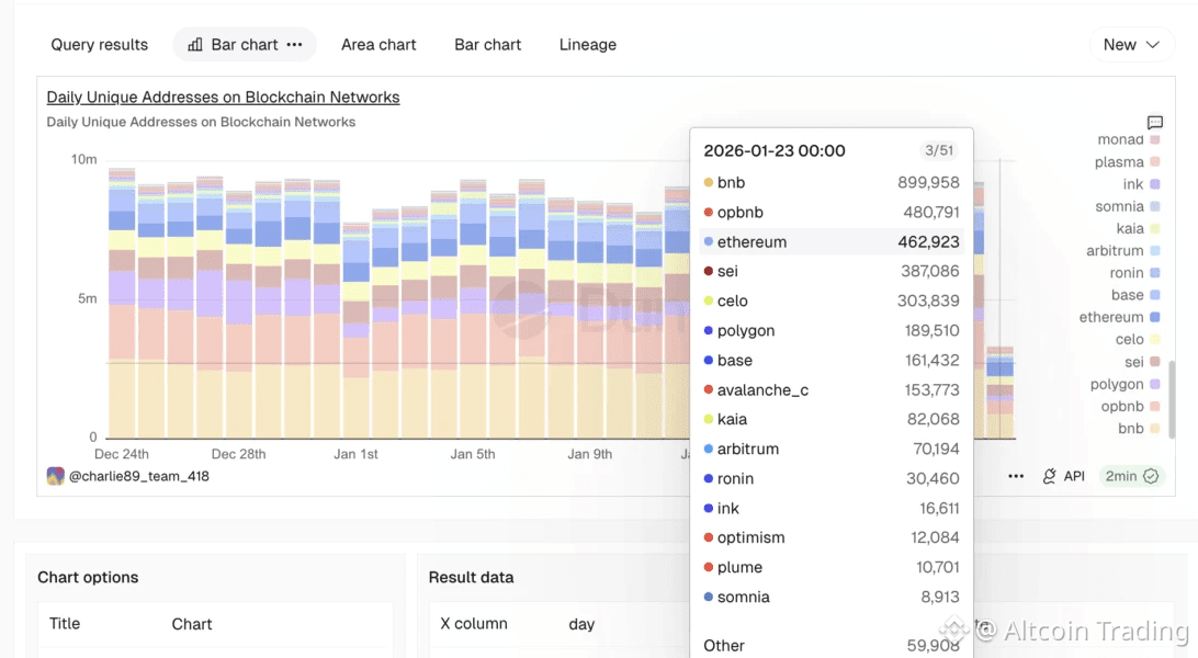 Техническая картина дополняется фундаментальными данными. По состоянию на 23 января Ethereum вернул себе второе место по числу уникальных адресов (DUA). Лидером среди сетей первого уровня остается BNB. Такие данные приводят аналитики BeInCrypto.