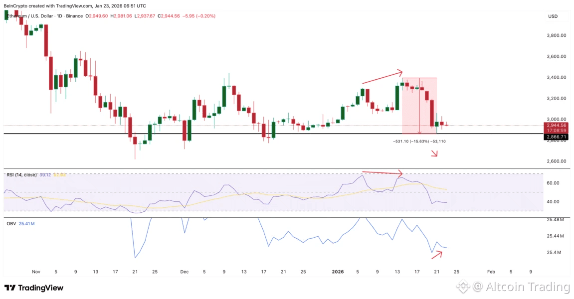 Ослабление позиций Ethereum не было внезапным. В период с 6 по 14 января на дневном графике сформировалась «медвежья» дивергенция RSI. Индекс относительной силы показал более низкий максимум на фоне роста цены актива. Такая техническая картина часто сигнализирует об истощении тренда.