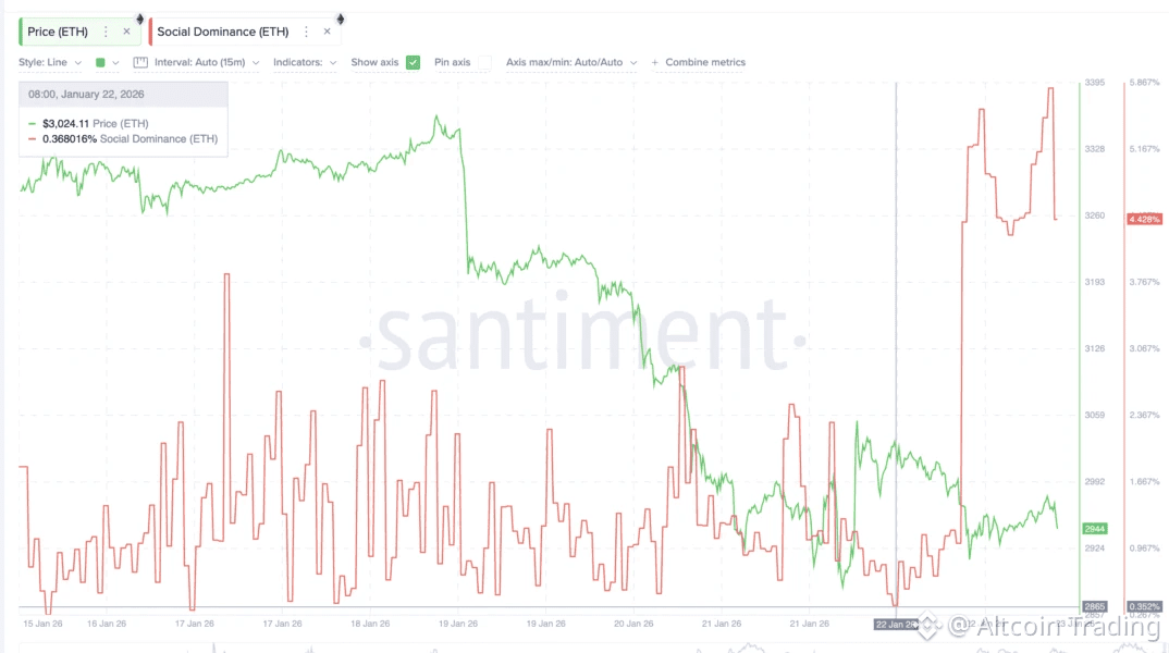 Восстановление фундаментальных метрик отразилось в информационном поле. Доля упоминаний Ethereum в социальных сетях резко выросла. Показатель поднялся с 0,37% до 4,43% по сравнению с предыдущим днем. В моменте значение достигало 5,8%.