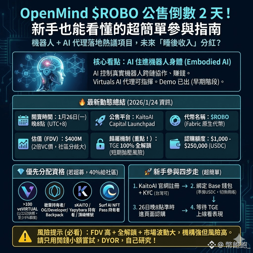 為什麼這個項目好玩? 簡單說:OpenMind 不是只做軟體 AI,而是讓 AI 「住進」機器人身體裡(embodied AI),透過 Fabric 網絡讓機器人互相合作、賺錢、分錢。這跟 Virtuals 生態超搭,未來 Virtuals 的 AI 代理可以指揮機器人幹活,revenue 可能回流給 $VIRTUAL / $ROBO 持有者。聽起來像科幻?但 demo 已經能讓機器人自主操作 DeFi 了!(不過目前還在早期階段,demo 規模小,實際落地需時間驗證)