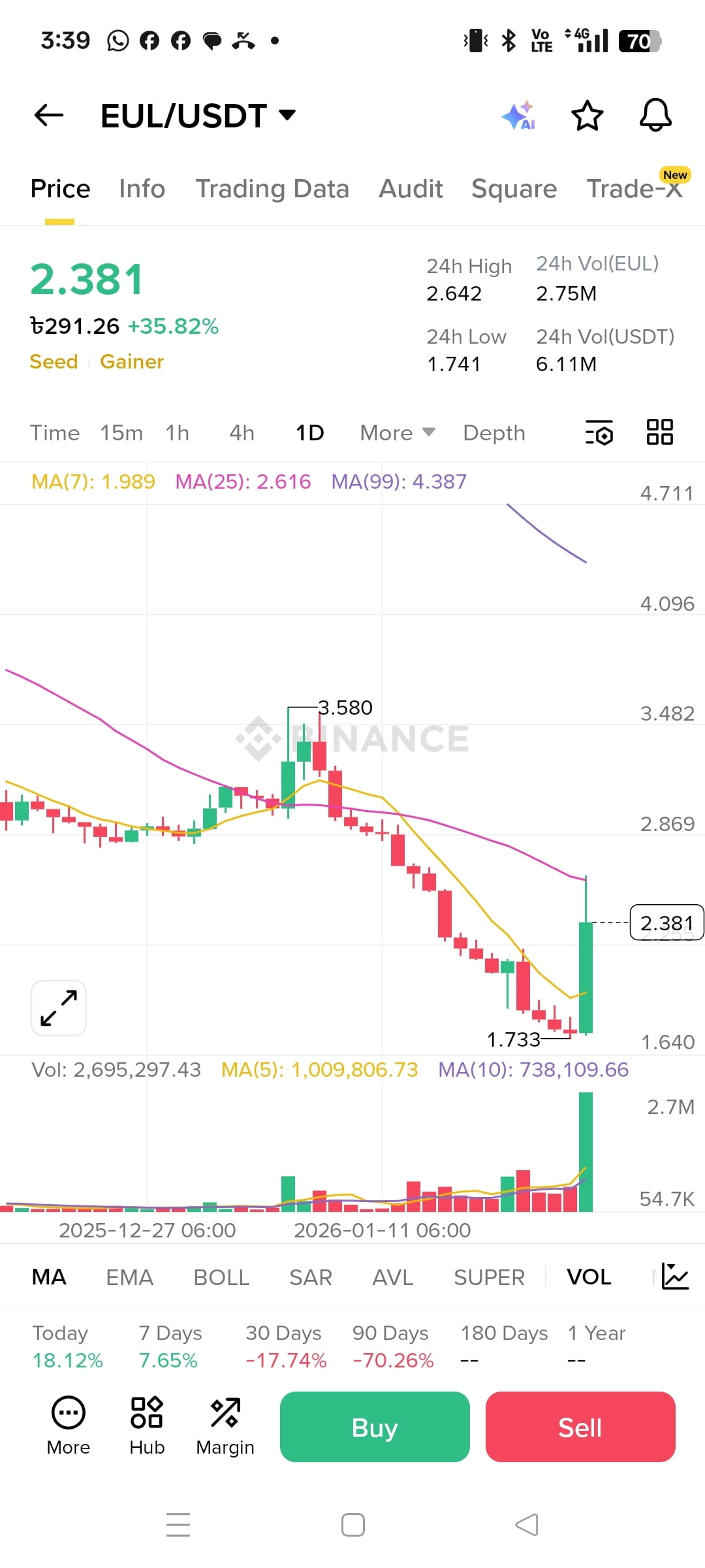 Nel grafico giornaliero, il prezzo ha registrato un forte rimbalzo da quella solida zona di domanda intorno a 1,70–1,75, supportato da una chiara candela di inversione in stile capitolazione e un volume visibilmente in espansione durante la risalita. Quel tipo di azione mostra i compratori che intervengono in modo aggressivo dopo un washout, il che è incoraggiante. Detto ciò, stiamo ancora operando al di sotto della media mobile a 25 giorni, quindi il trend più ampio non è ancora completamente cambiato in rialzo—questo rimane più una ripresa di mean-reversion e un primo tentativo di cambiare momentum piuttosto che un trend rialzista confermato.