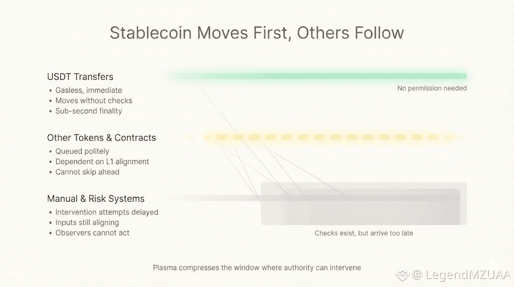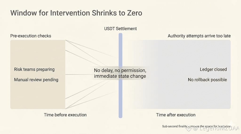 Most payment rails leave a soft space after execution. A grace period. A chance for someone upstream to say wait. Plasma compresses that space until it stops being useful. Sub-second finality isn’t about speed here. It’s about shrinking the window where authority can still matter.
