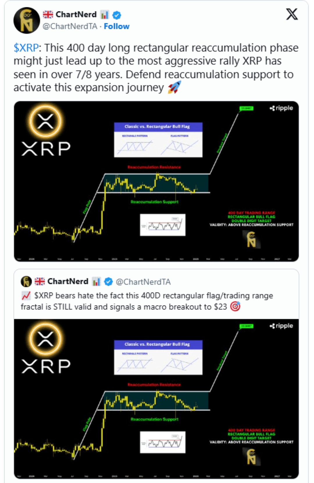 Secondo l'analista tecnico ChartNerd, la struttura attuale di XRP si adatta al profilo di una bandiera di rialzo rettangolare di riaccumulo. Dopo l'espansione iniziale, il prezzo ha smesso di seguire una tendenza e ha iniziato a muoversi lateralmente tra supporto e resistenza ben definiti. Ciò che conta di più è che XRP continui a mantenersi al di sopra del limite inferiore di questo intervallo, suggerendo che la pressione di vendita viene assorbita piuttosto che accelerata.