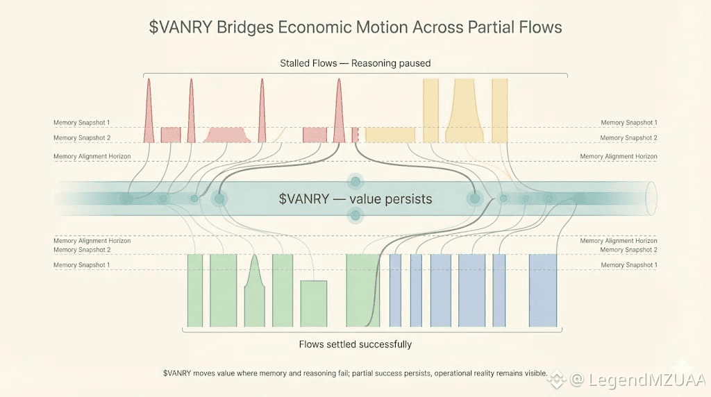 $VANRY persists. Economic exposure exists only in transactions that actually land. It bridges gaps where Vanar reasoning fails. Where memory diverges. Where partial settlements hang.