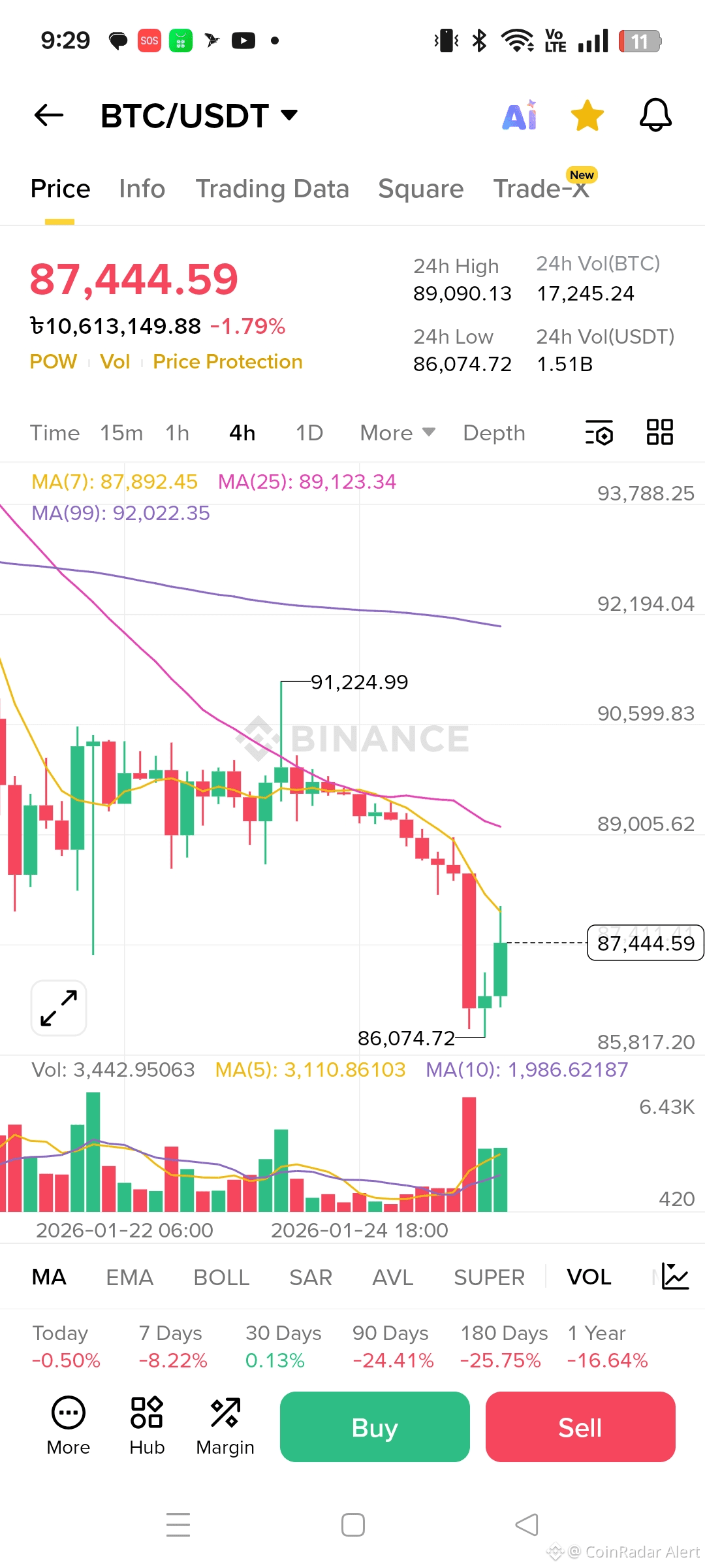 Right now on the 4-hour chart, Bitcoin has just gone through a pretty sharp sell-off that swept liquidity down around the 86,074 area. What caught my eye was the strong bullish reaction candle that printed right after, backed by solid volume expansion. Price is currently bouncing nicely off that key demand zone sitting between roughly 86k and 86.2k. Keep in mind the bigger picture: the overall trend remains bearish (we're still trading below both the MA25 and MA99), so this isn't some magical trend reversal—it's more of a relief bounce or pullback trade with limited upside expectations.