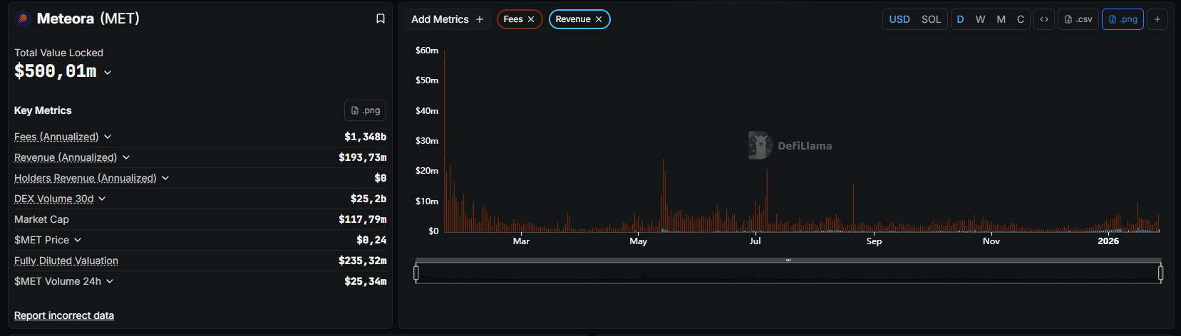 Ad esempio, nell'immagine vediamo che le entrate del progetto Meteora sono estremamente elevate, ma non vengono condivise né utilizzate per il buyback del token.$MET Questo porta a un prezzo del token estremamente stagnante.